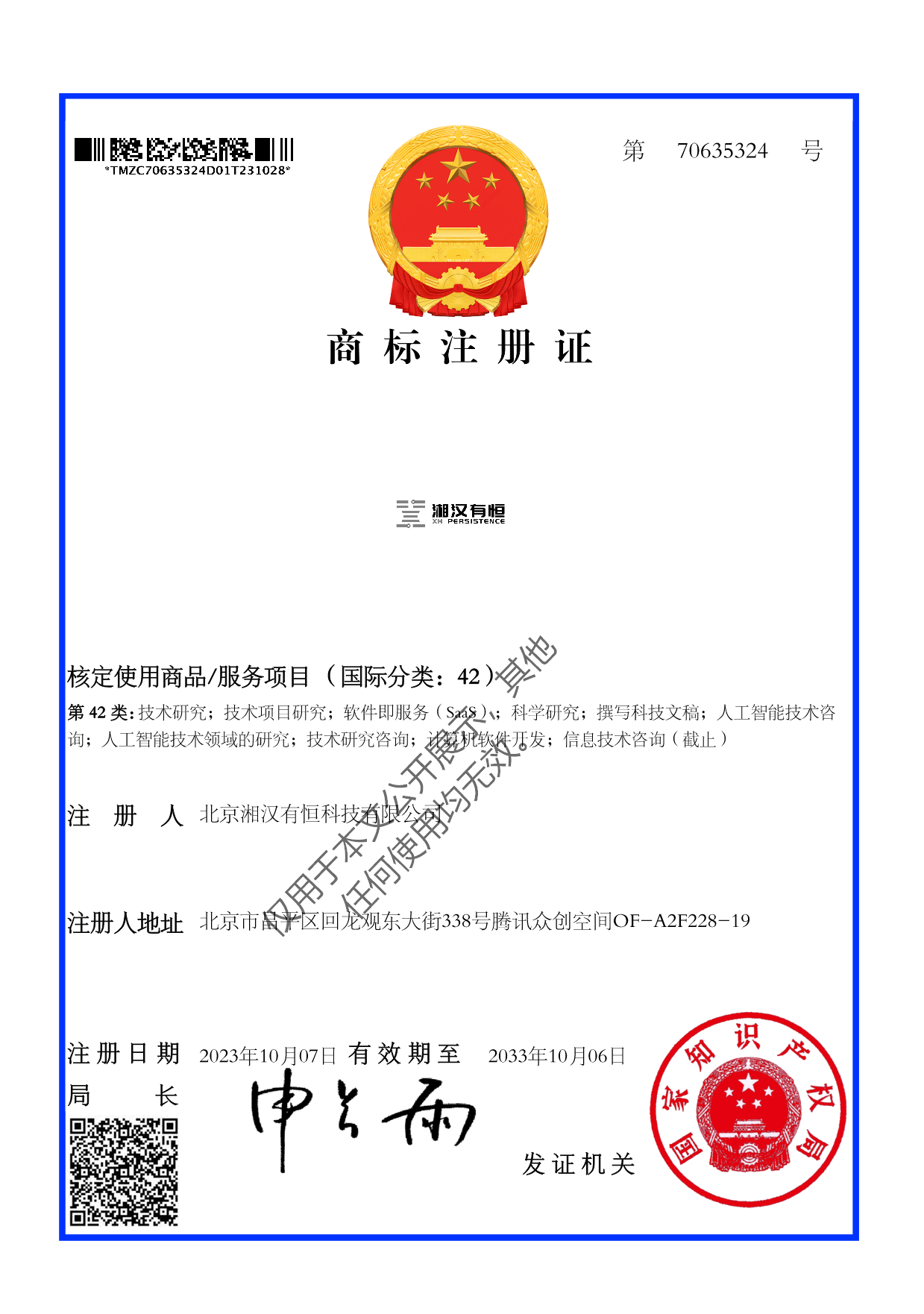 2023年10月31日,国家知识产权局下发“湘汉有恒”(logo)商标注册证书(核定使用商品/服务项目,国际分类:42,第42类:技术研究;技术项目研究;软件即服务(SaaS);科学研究;撰写科技文稿;人工智能技术咨询;人工智能技术领域的研究;技术研究咨询;计算机软件开发;信息技术咨询),标志着“湘汉有恒”商标成功注册。